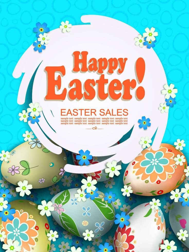 Blue composition with an abstract round white frame, Easter eggs with a pattern and flowers. Pro Vector