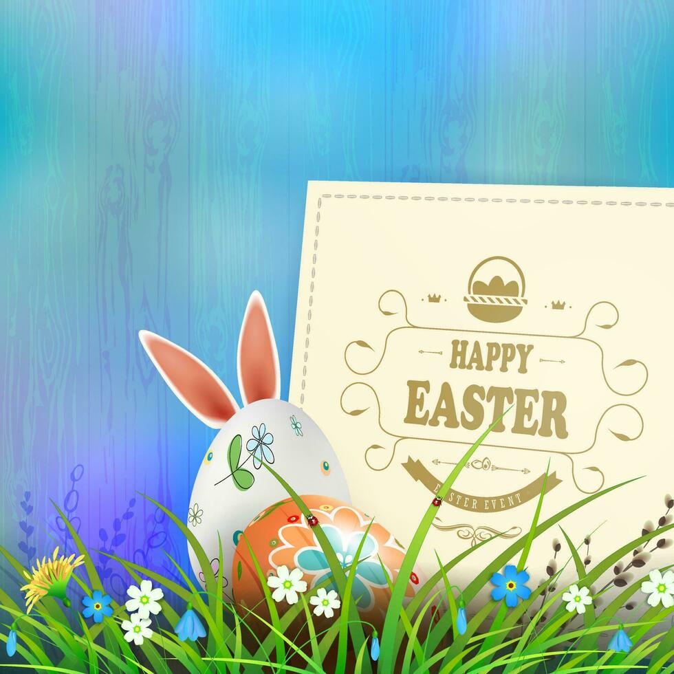 Easter composition in a light blue hue with a square frame, eggs and rabbit ears, spring flowers with willow twig and grass. Pro Vector
