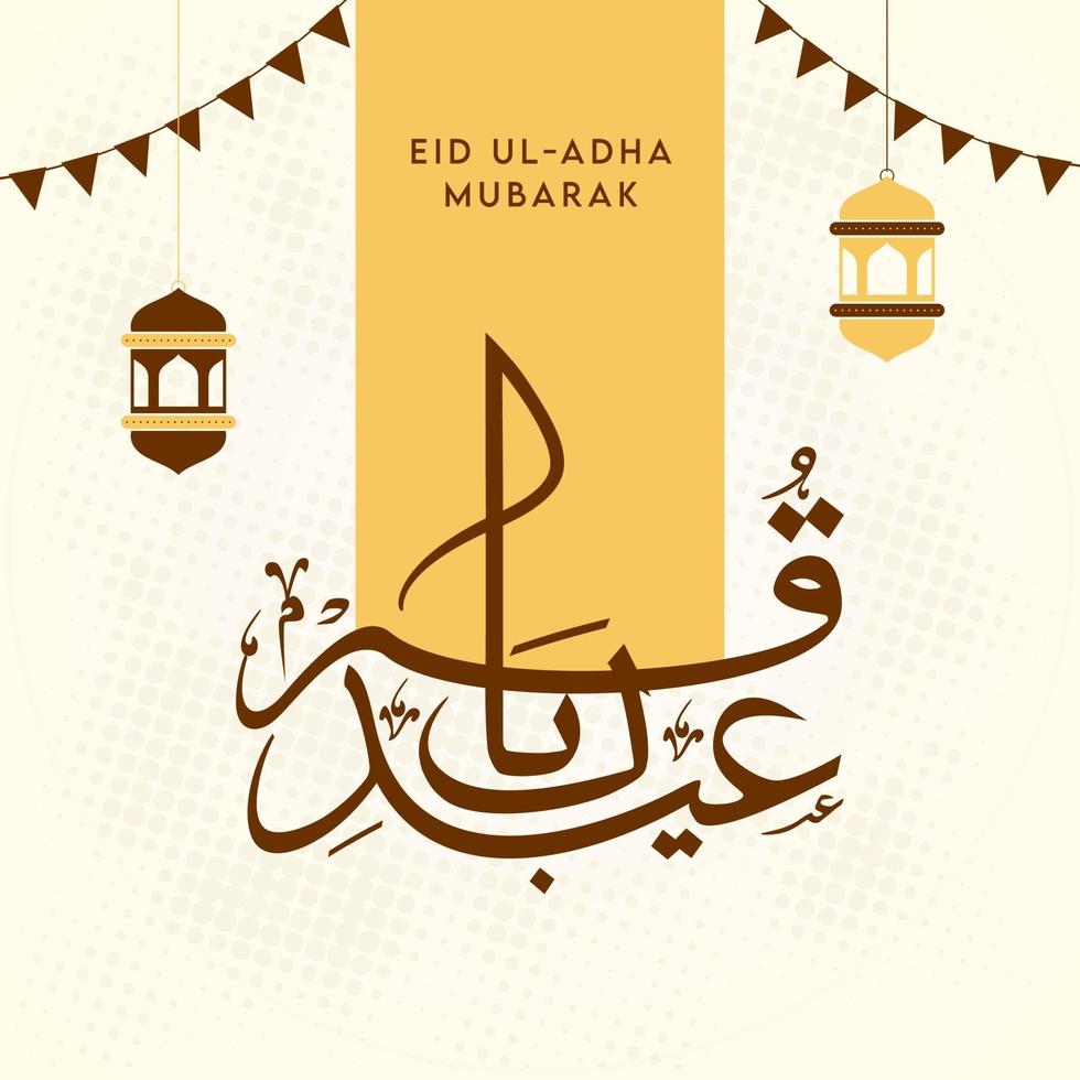 Eid-Ul-Adha Mubarak Calligraphy in Arabic Language with Hanging Lanterns and Bunting Flags on White Halftone Background. Pro Vector