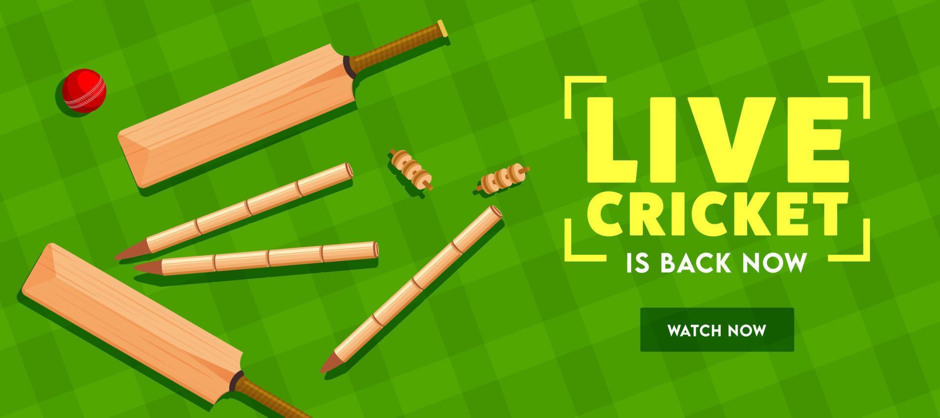 Live Cricket Is Back Now Text with Top View of Bat, Ball and Wicket Stumps on Green Tartan Pattern Background. Header or Banner Design. Pro Vector