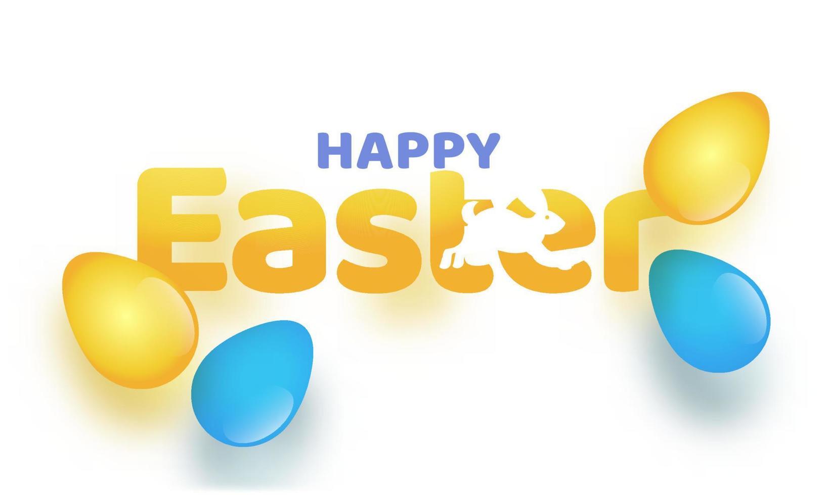 Happy Easter Text with Rabbit Running and Glossy Eggs on White Background. Pro Vector
