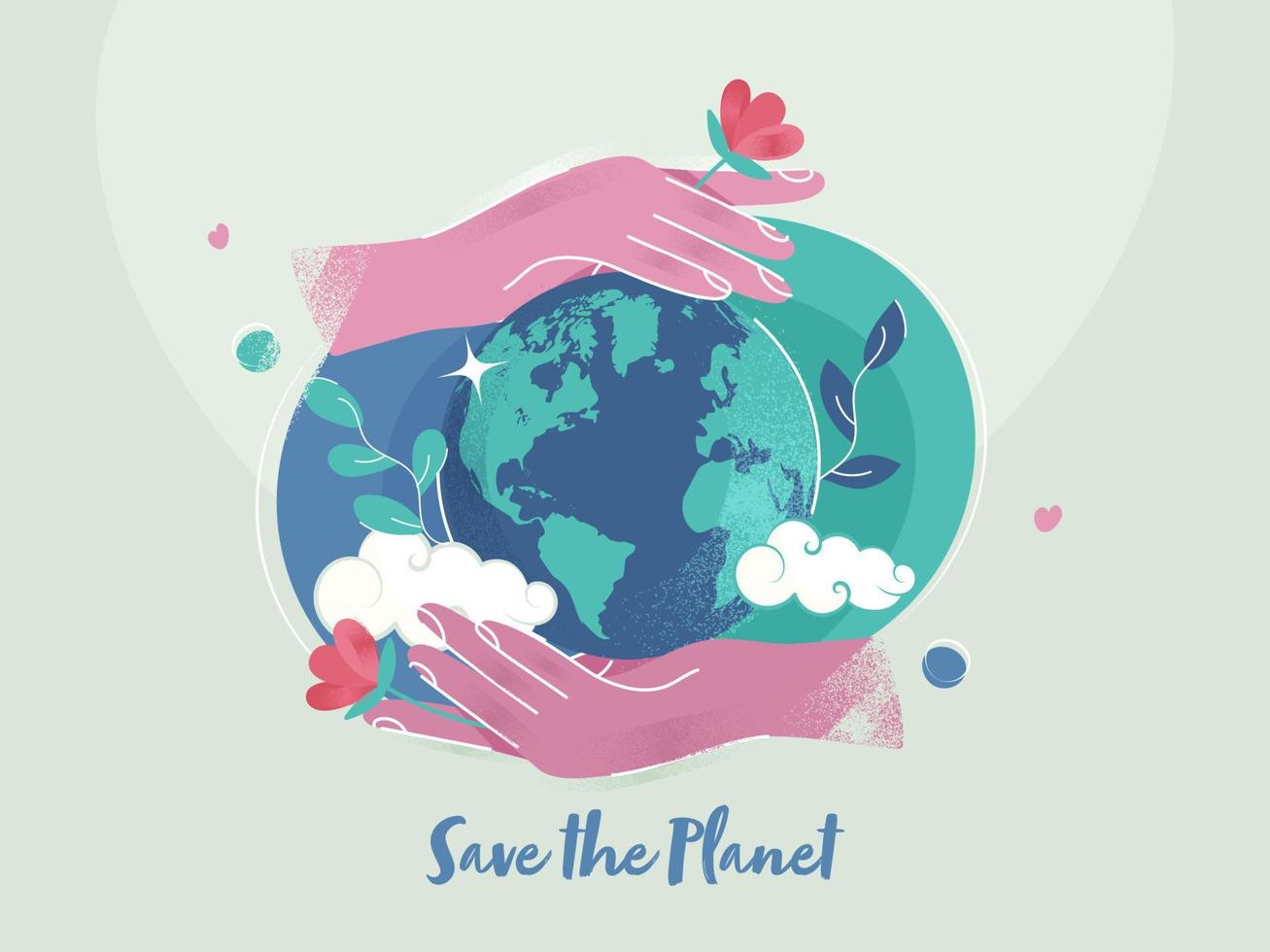 Illustration of Two Hands Protecting Earth Globe with Noise Effect on Light Green Background for Save The Planet Concept. Pro Vector