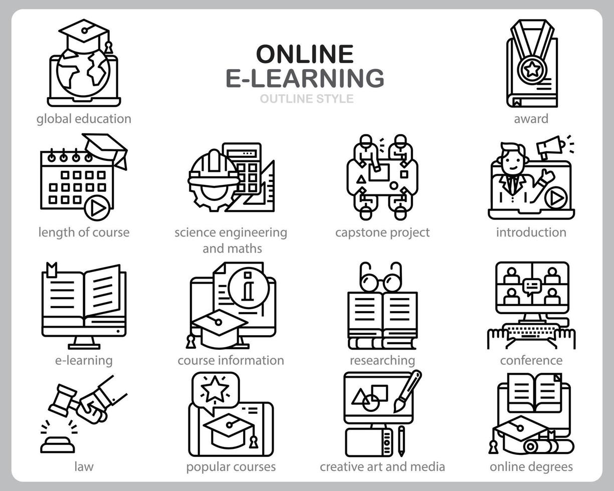 Online Learning icon set for website, document, poster design, printing, application. Online course concept icon outline style. Pro Vector