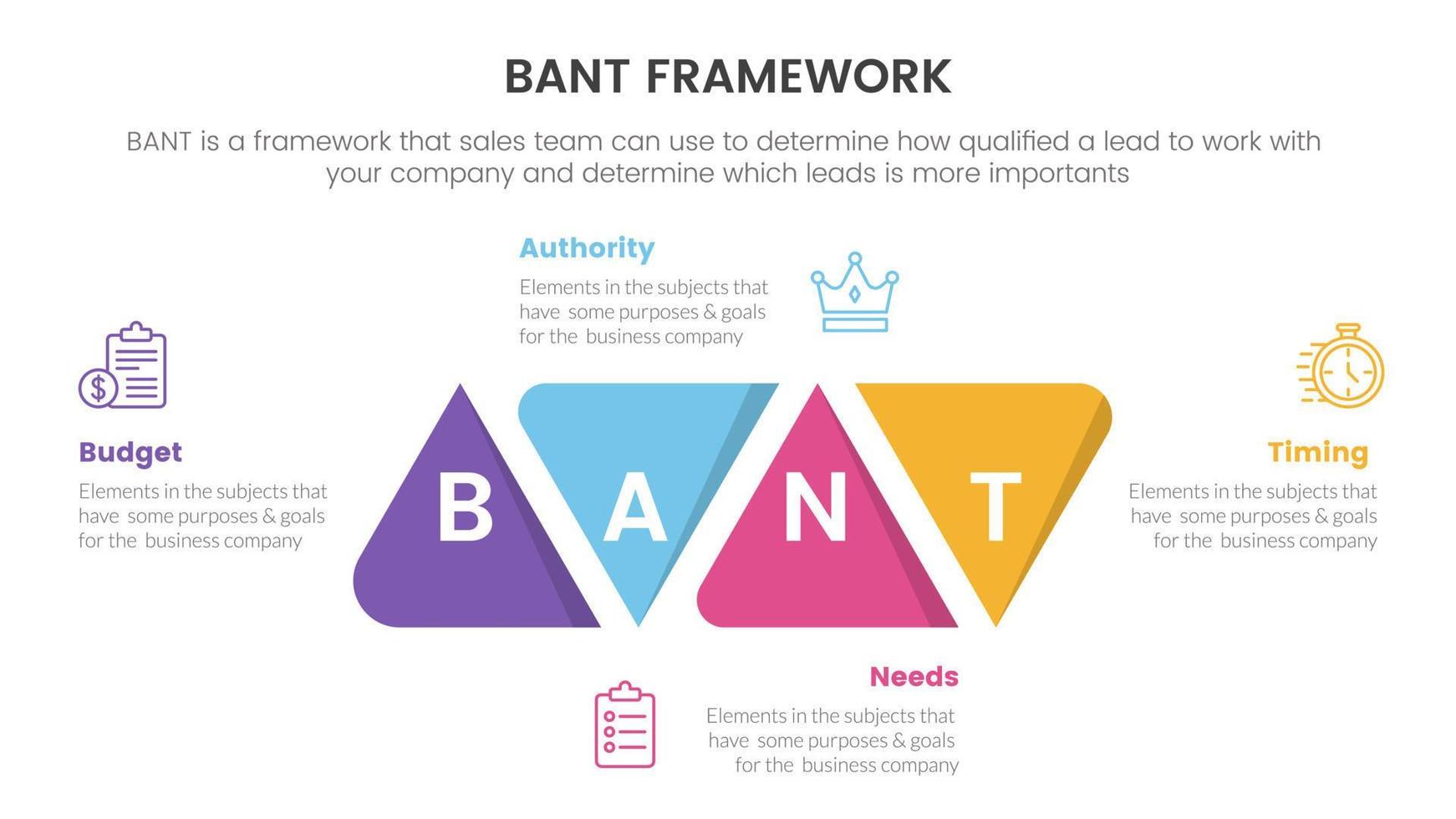 bant sales framework methodology infographic with round triangle shape modification information concept for slide presentation vector