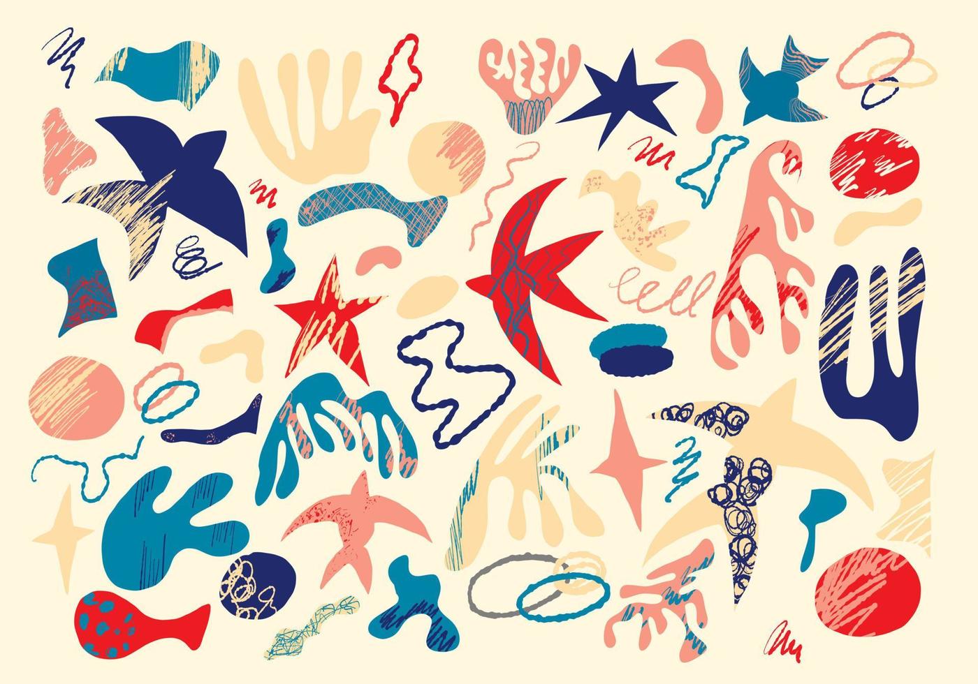 A large vector set with abstract elements, stars and birds in the matisse style. Abstract geometric elements for design. Pro Vector