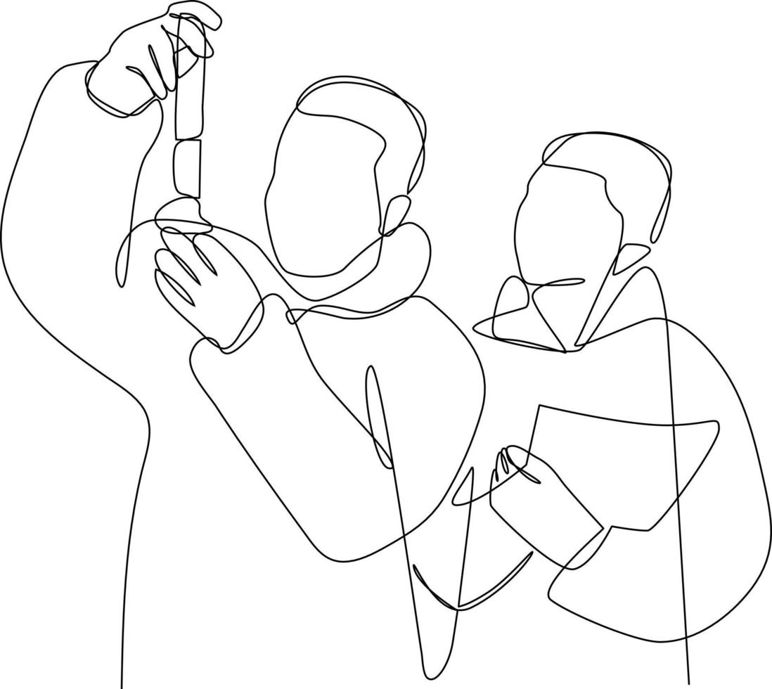 Continuous one line drawing scientist doing some research. laboratory activity concept. Single line draw design vector graphic illustration. Pro Vector