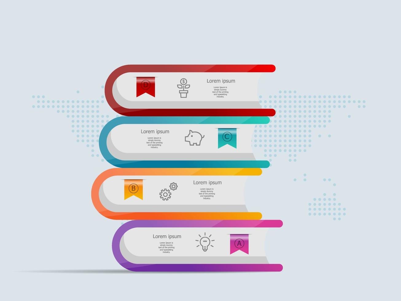 stack of books infographics template 4 steps with world map for business and presentation Pro Vector