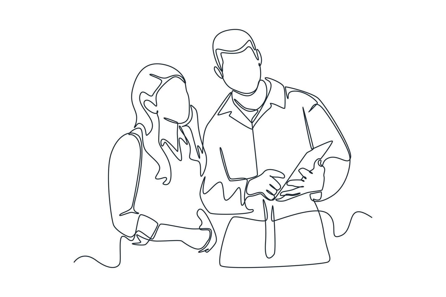 Single one line drawing Mechanic show the car checking list for customer. Auto service concept. Continuous line draw design graphic vector illustration. Pro Vector