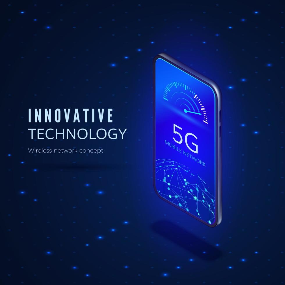 5G network innovation technology banner. Wireless systems and internet. Communication network. Mobile phone with internet speed indicator and global network. Vector illustration Pro Vector