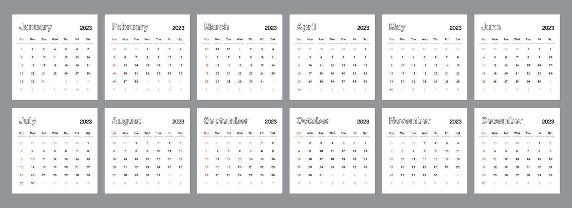 Classic monthly calendar for 2023. Calendar in the style of minimalist square shape. The week starts on Sunday. Pro Vector