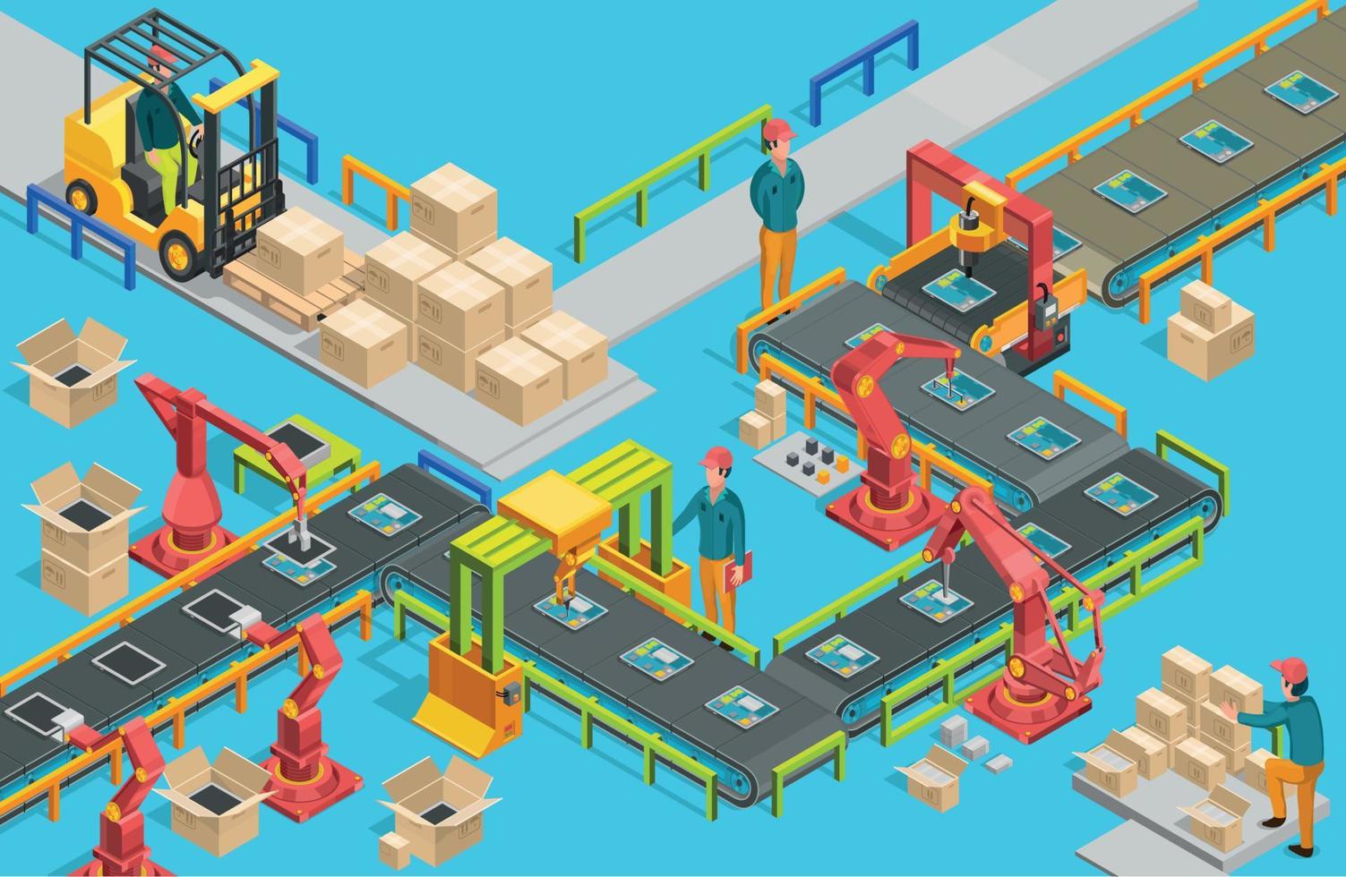 Automatic factory with conveyor line and robotic arms. Assembly process. Vector illustration Pro Vector