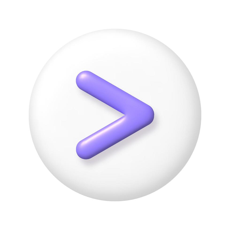 Math 3D icon. Purple arithmetic greater than sign on white round button. 3d realistic design element. Pro Vector