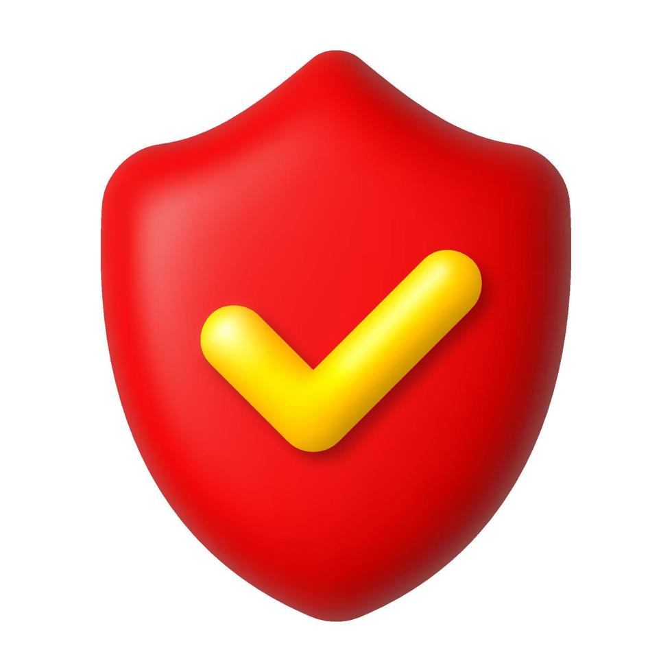 Yellow check mark on red shield 3d icon. Security and protection concept. 3d realistic vector design element. Pro Vector