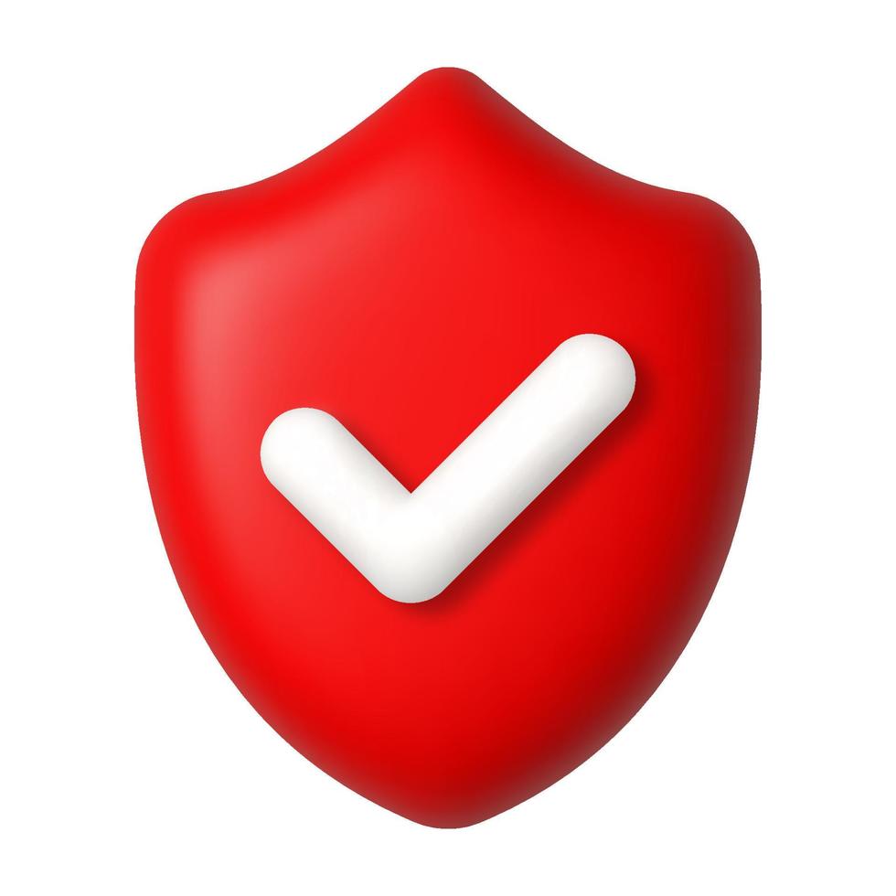 White check mark on red shield 3d icon. Security and protection concept. 3d realistic vector design element. Pro Vector