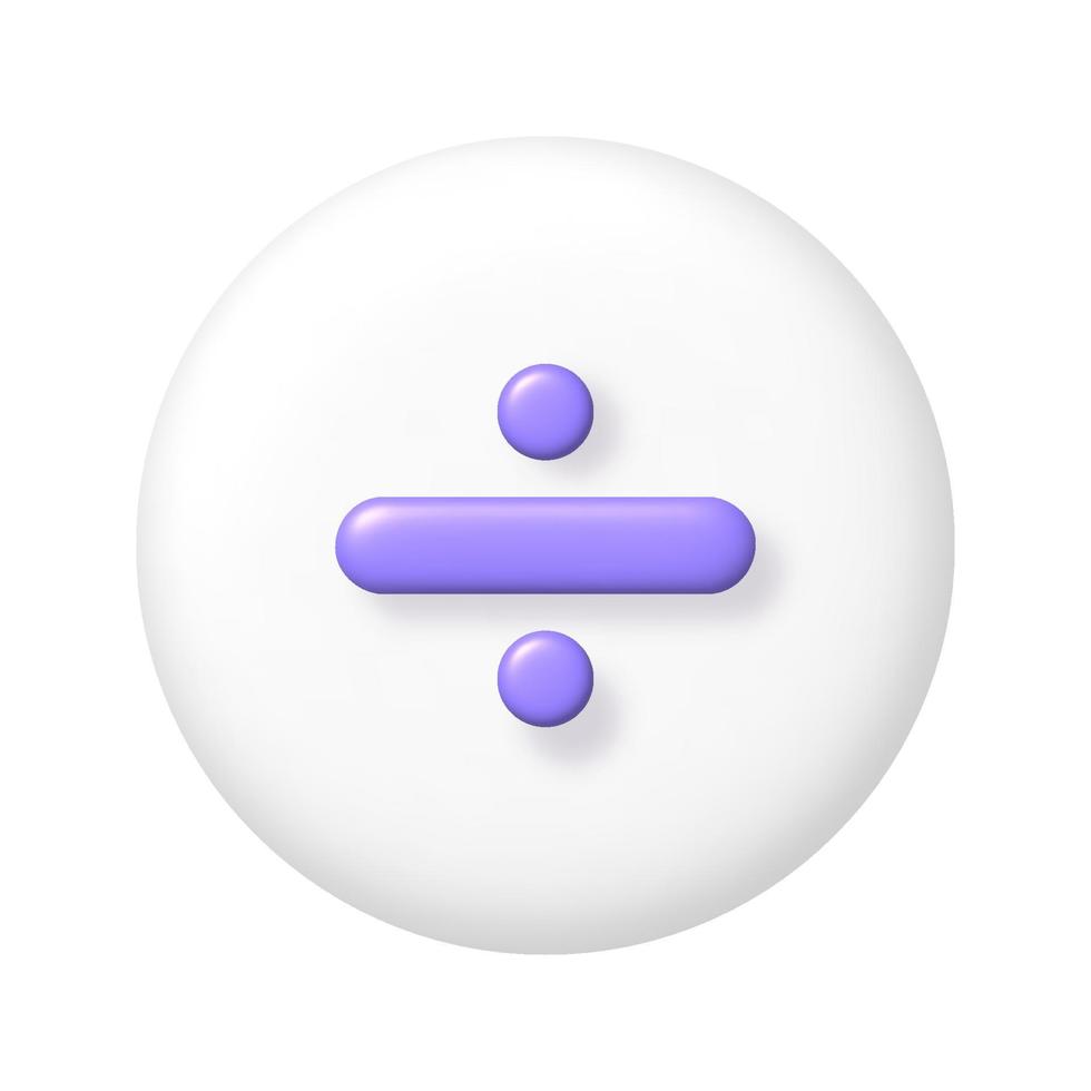 Math 3D icon. Purple arithmetic division sign on white round button. 3d realistic design element. Pro Vector