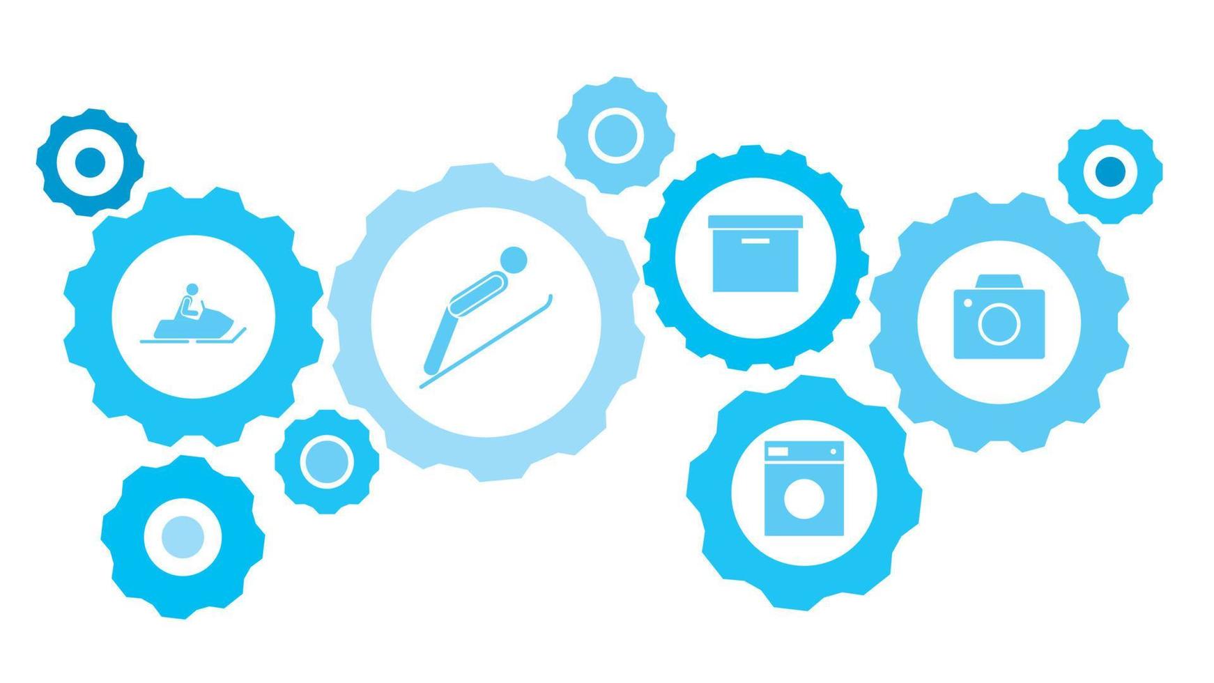 Old digital camera gear blue icon set. Abstract background with connected gears and icons for logistic, service, shipping, distribution, transport, market, communicate concepts Pro Vector