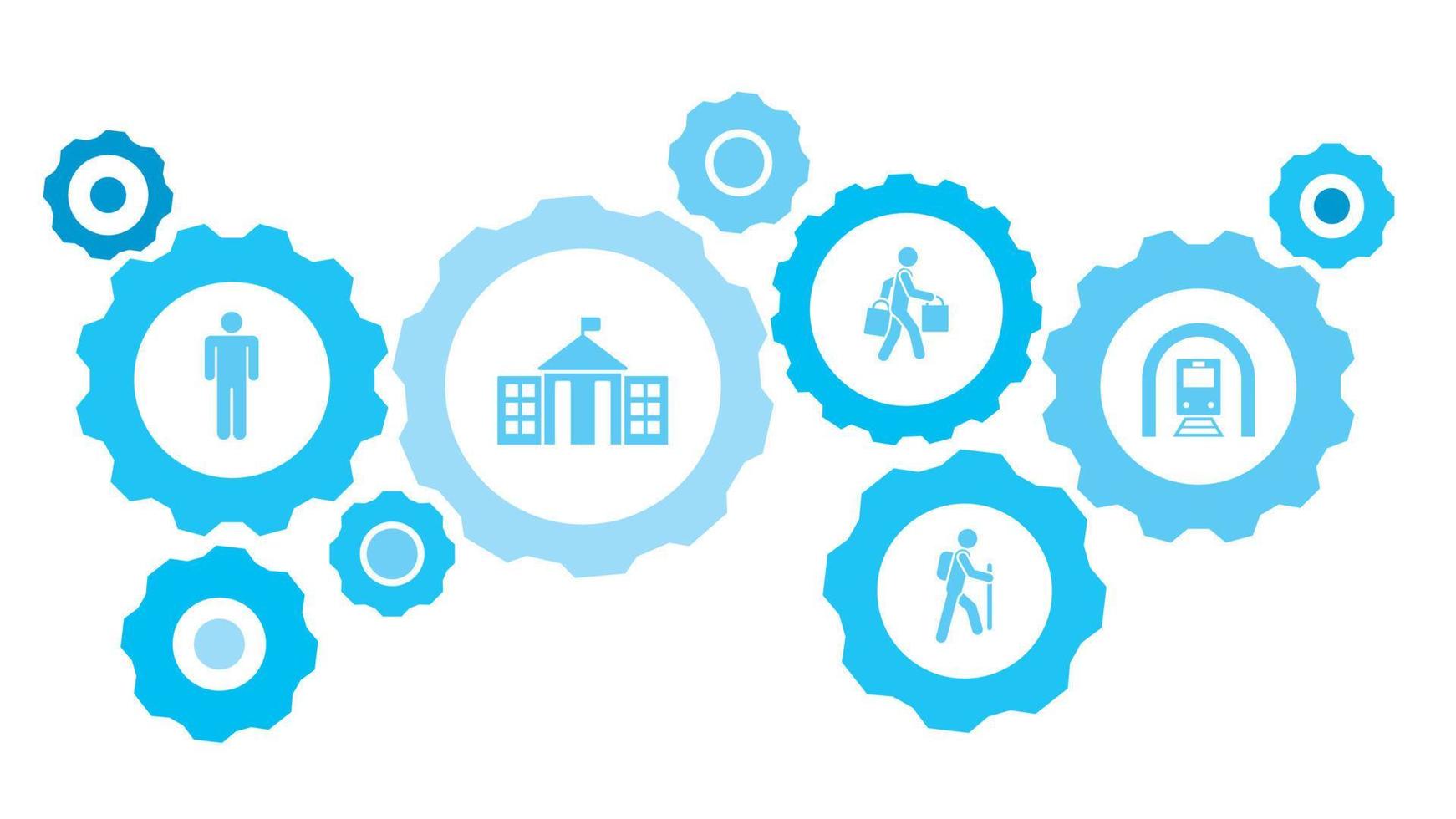 Train, tunnel gear blue icon set. Abstract background with connected gears and icons for logistic, service, shipping, distribution, transport, market, communicate concepts Pro Vector