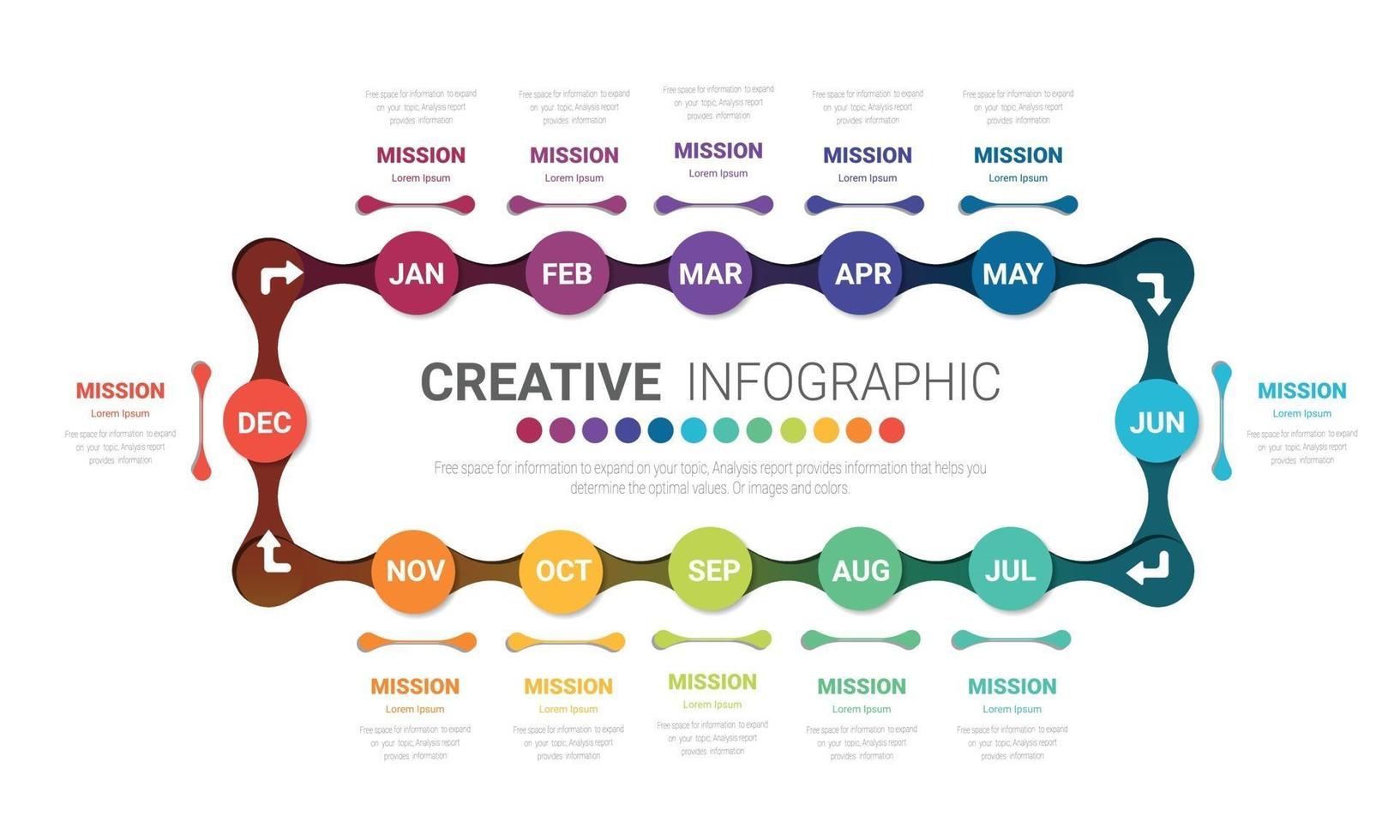 Timeline for 1 year, 12 months, infographics all month planner design and Presentation business can be used for Business concept with 12 options, steps or processes. Pro Vector