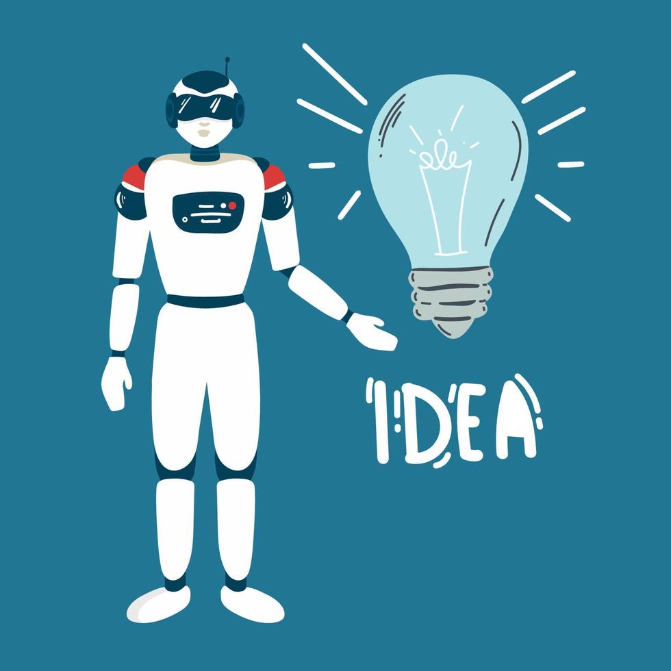 Robot hold lightbulb develop innovative business idea or strategy. Robotic humanoid brainstorm show artificial intelligence. Innovation and science concept. Chat bot. vector illustration. Pro Vector