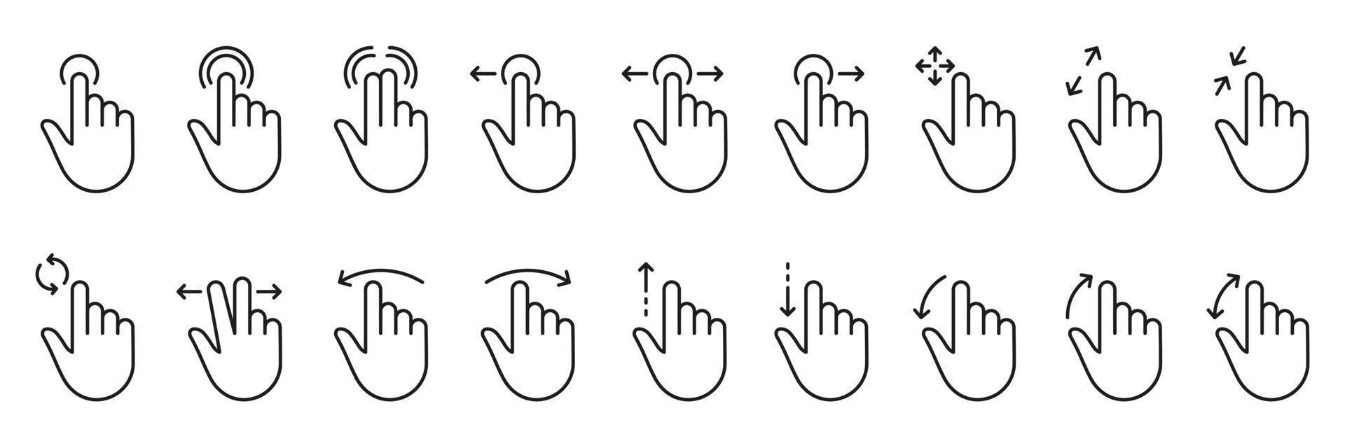 Hand Finger Touch, Swipe and Drag Outline Icon Set. Pinch Screen, Rotate Up Down on Screen Line Sign. Gesture Slide Left and Right Linear Pictogram. Editable Stroke. Isolated Vector Illustration. Pro Vector