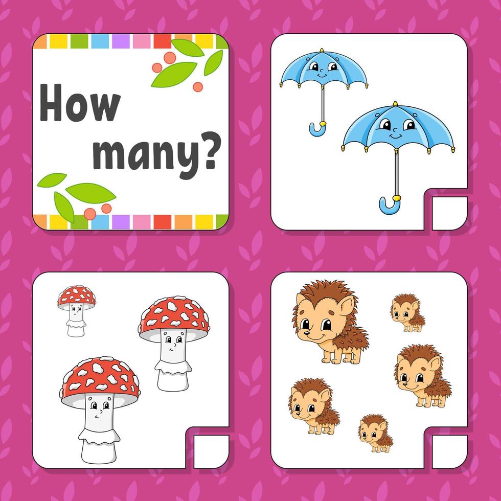 Counting game for children. Happy characters. Learning mathematics. How many object in the picture. Education worksheet. With space for answers. Vector illustration. Pro Vector