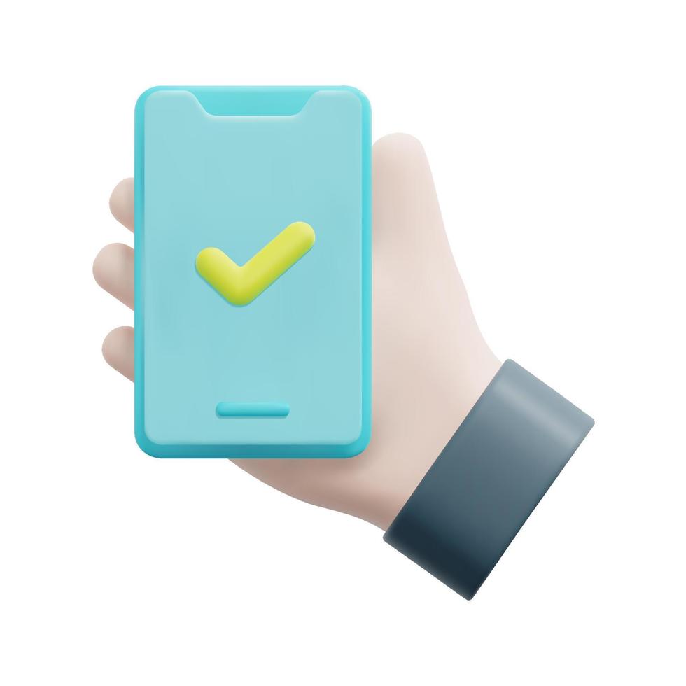 3d hand holding mobile with check mark icon vector. Isolated on white background. 3d ux and ui concept. Cartoon minimal style. 3d test icon vector render illustration. Pro Vector