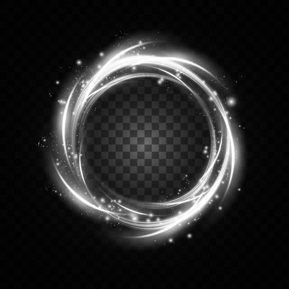 White glowing shiny spiral lines, round frames. Abstract effect of movement with the speed of light. Shiny wavy path. Light painting. Easy trail. Pro Vector