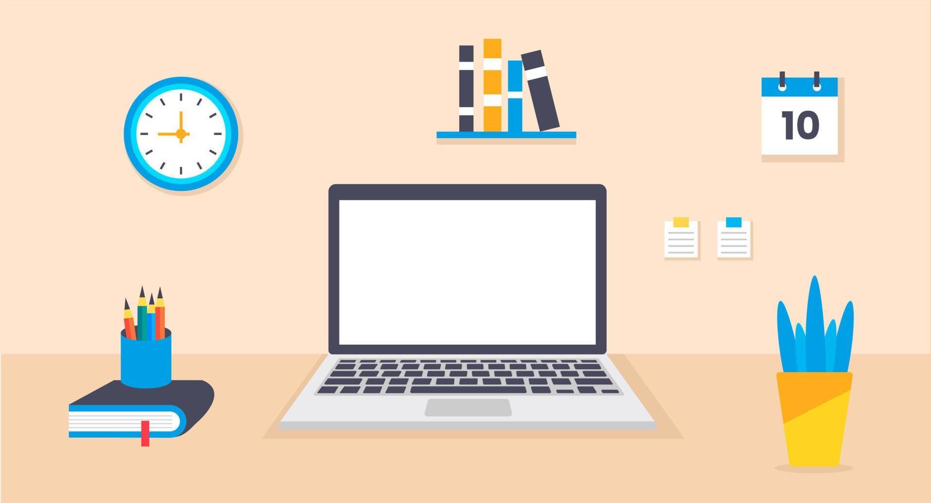 laptop computer desk with white empty display screen for working space, vector laptop computer flat design illustration. computer desk design. laptop computer desk design template. Pro Vector