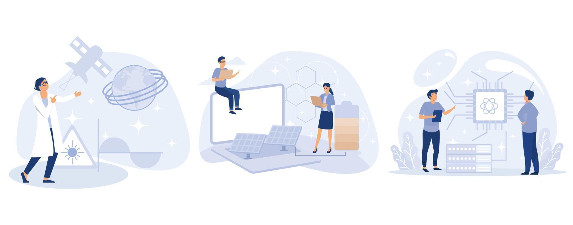 Innovative science concept Laser and graphene technologies, quantum computing, computer science, carbon dioxide nanomaterial, set flat vector modern illustration Pro Vector