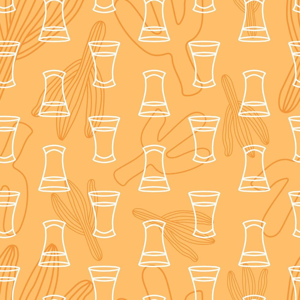 Seamless pattern with doodle tequila shot and cacti. Hand drawn tequila shot with cactus elements in seamless pattern. Pro Vector