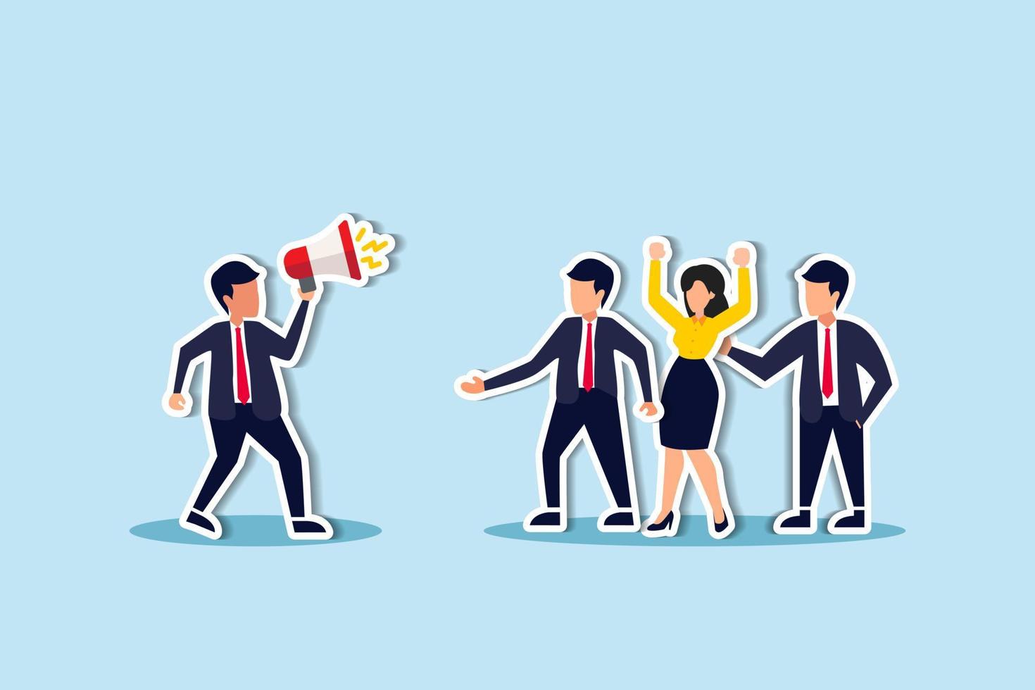 Effective communication, clear and concise message, leadership skill to communicate with team concept, confidence businessman manager talk with team through megaphone in clear discussion meeting Pro Vector