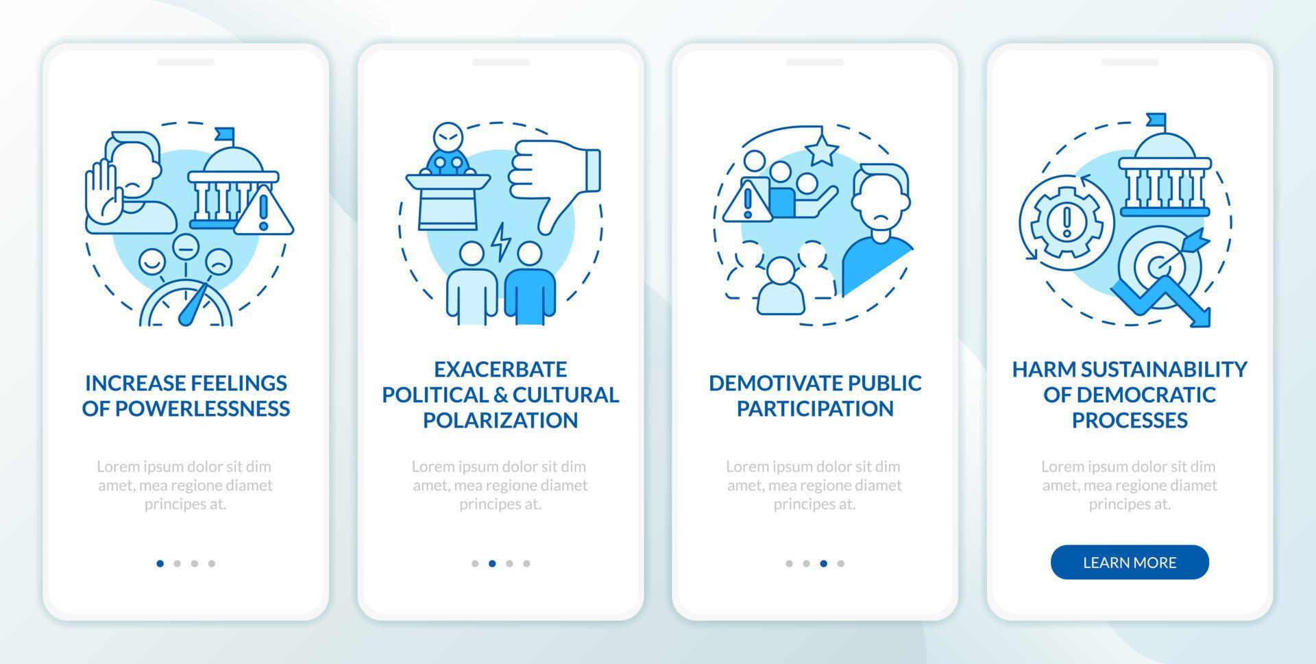 Conventional involvement issues blue onboarding mobile app screen. Walkthrough 4 steps editable graphic instructions with linear concepts. UI, UX, GUI template Pro Vector and Pro SVG