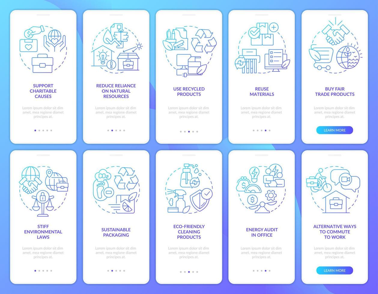 Sustainable business model blue gradient onboarding mobile app screen set. Walkthrough 5 steps graphic instructions with linear concepts. UI, UX, GUI template Pro Vector