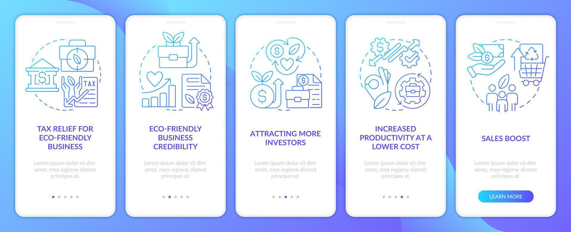 Environmental brand benefits blue gradient onboarding mobile app screen. Walkthrough 5 steps graphic instructions with linear concepts. UI, UX, GUI template Pro Vector