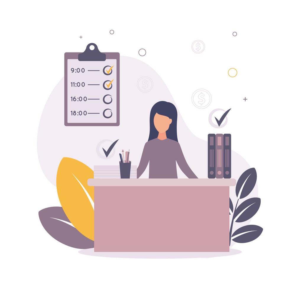 Time management. Illustration of a woman sitting at a table on which papers and folders, above them a check mark about a job, on a background a graph, plants, coins Pro Vector