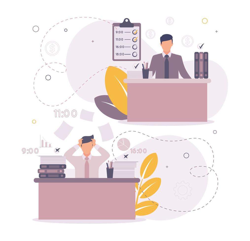 Time management illustration. Illustration of a man sitting at a table on which papers and folders, a checkmark above them on a task Pro Vector