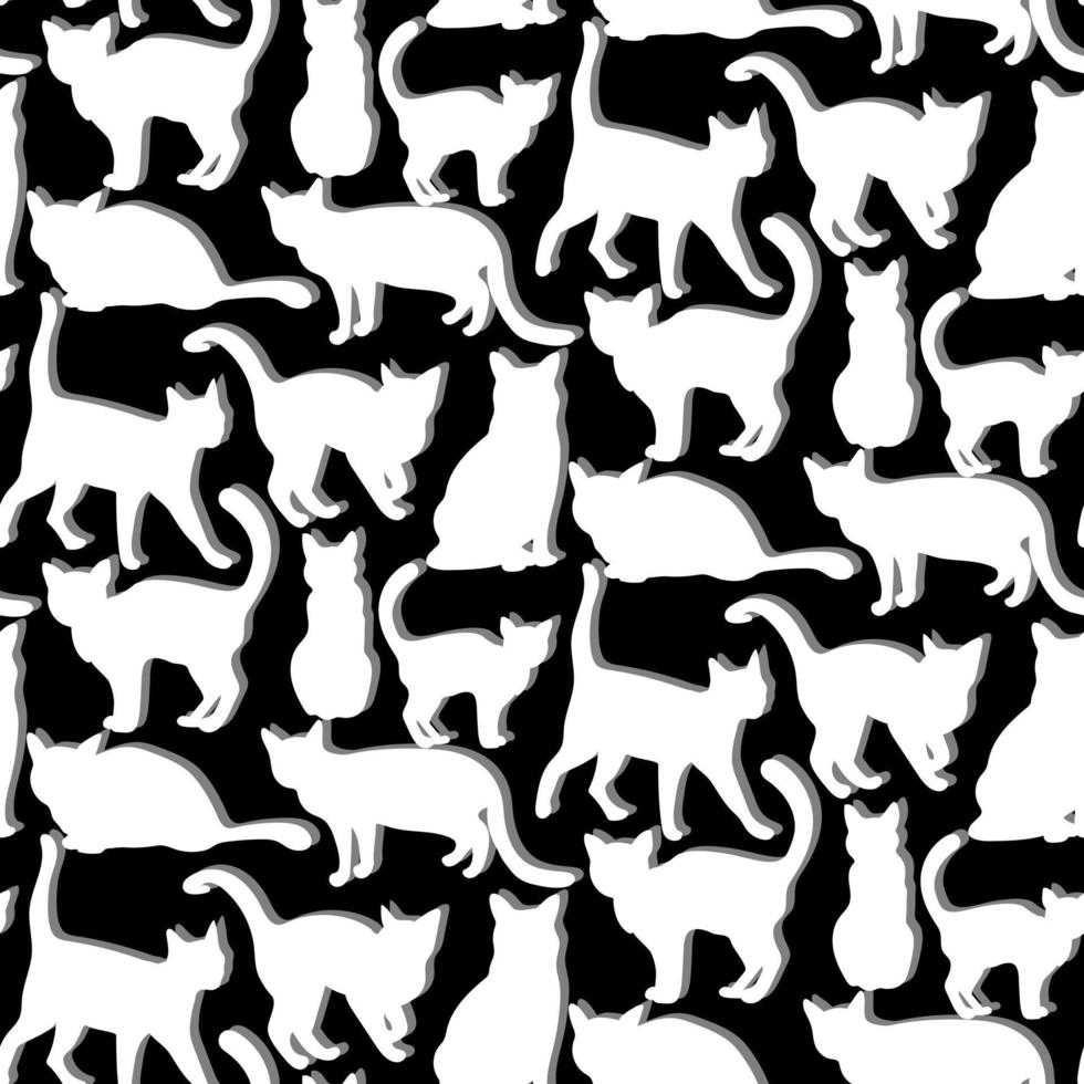 Seamless pattern depicting the outline of a white cat with a light shadow for Halloween. Flat cat in different poses. For printing on textiles and paper. Package. White outline with shadow on black vector