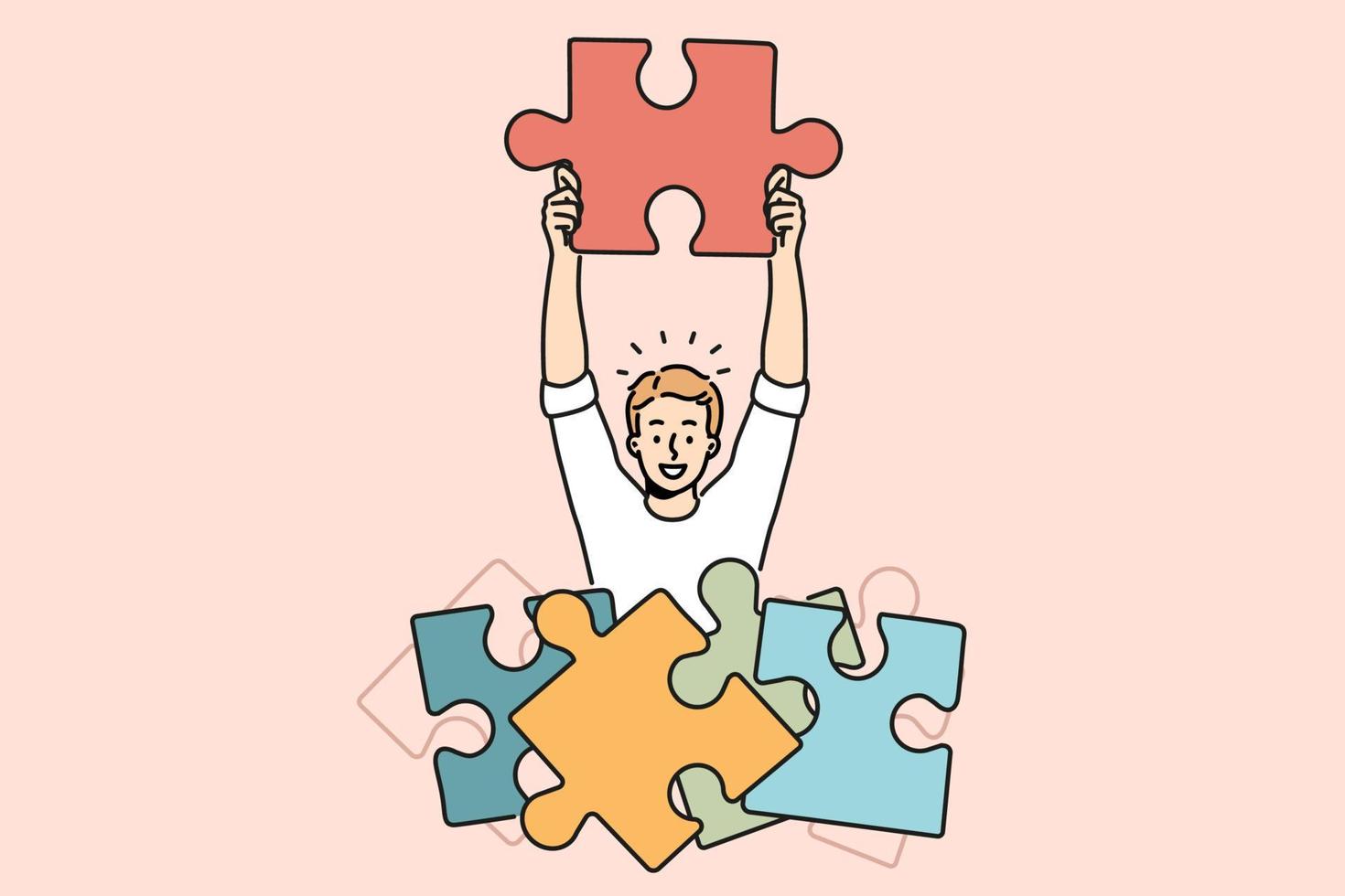 Smiling man with jigsaw puzzles brainstorm find solution to business problem. Happy male employee connect puzzles look for solution. Vector illustration. Pro Vector