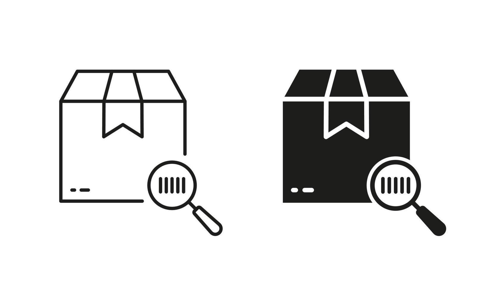Barcode on Parcel Box with Magnifier Scanner Silhouette and Line Icon Set. Search Product Bar Code on Cardboard Package. Find Tracking Number Icon. Editable Stroke. Isolated Vector Illustration. Pro Vector