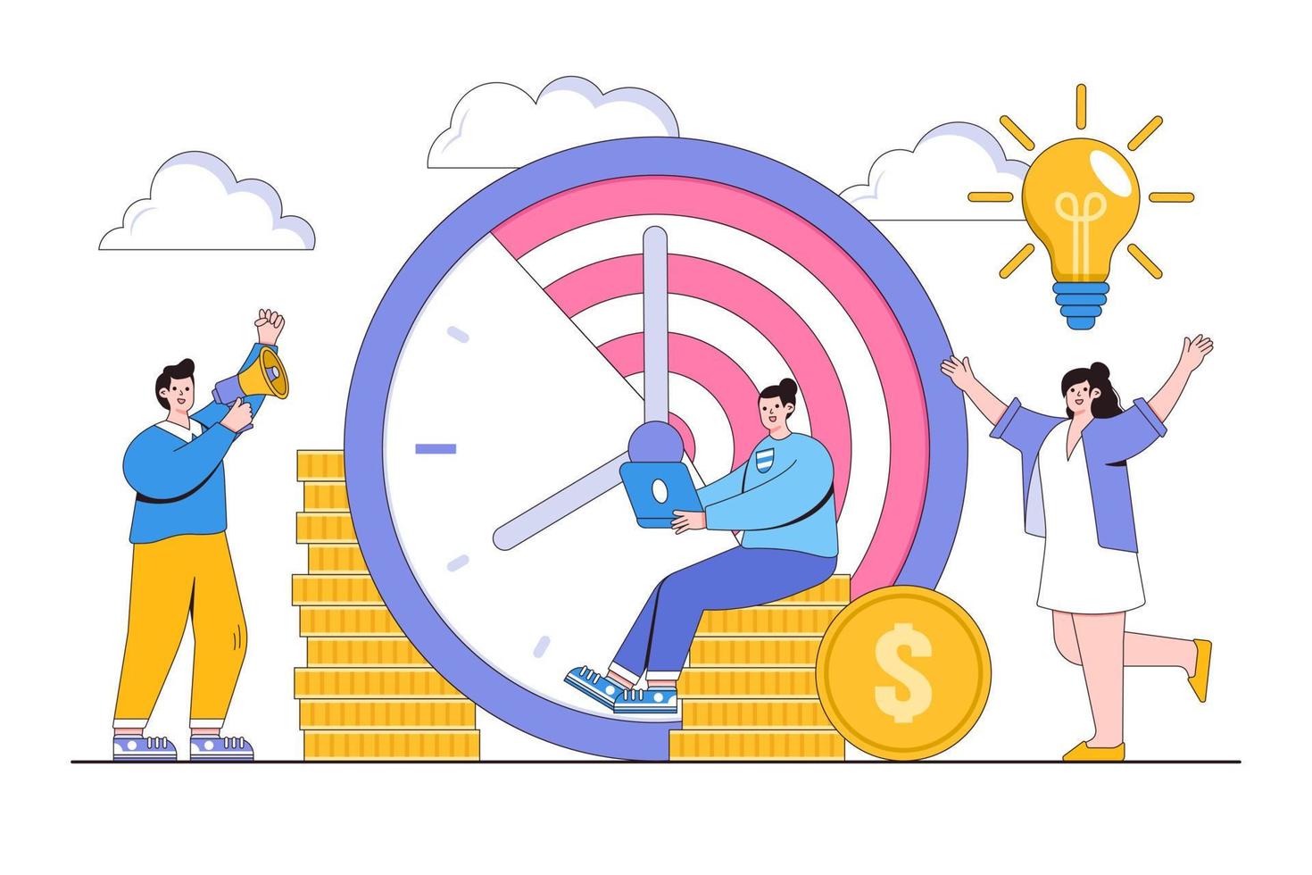Teamwork, time management and make money concept. People characters working together with clock. Outline design style minimal vector illustration for landing page, web banner, hero images Pro Vector