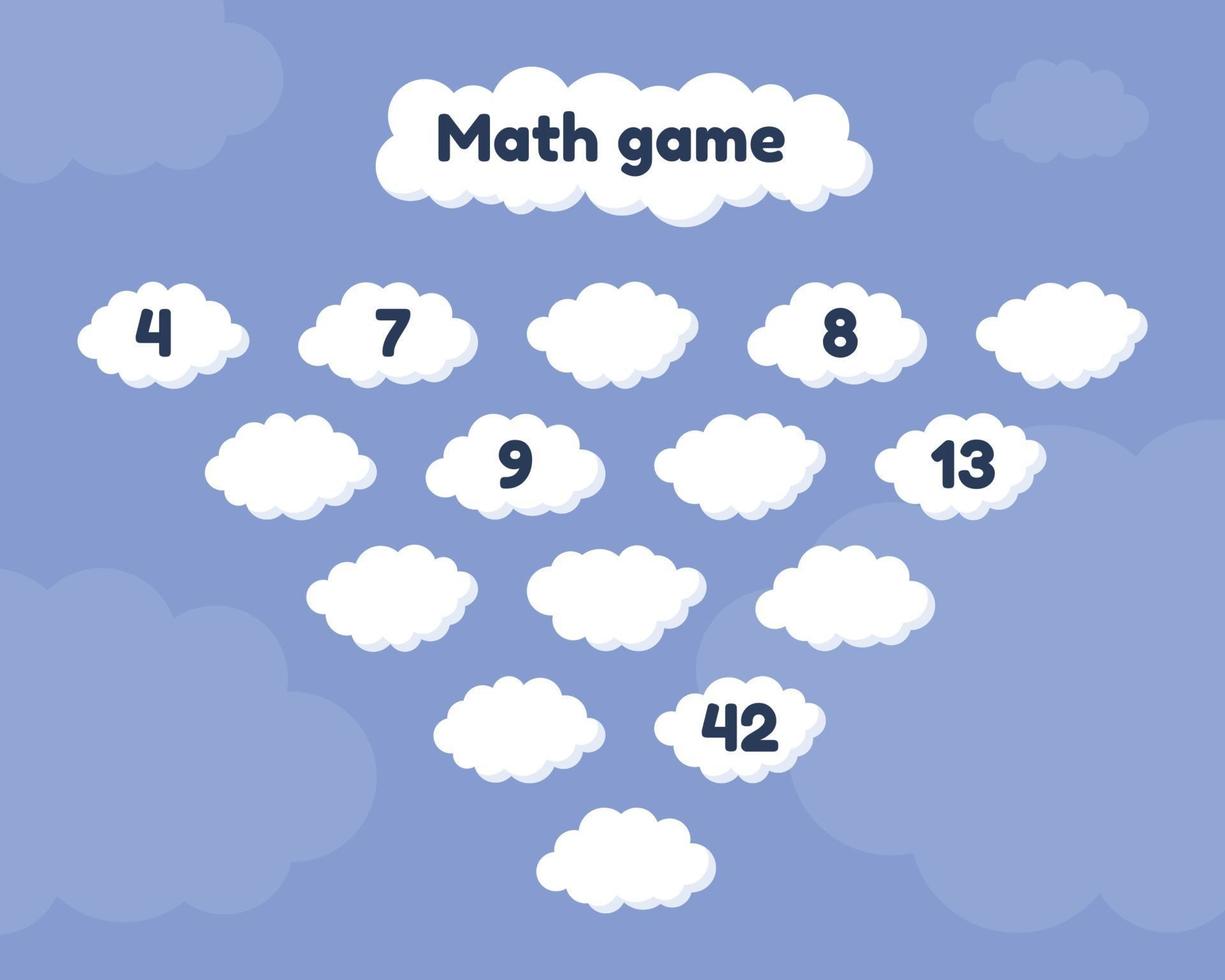 Math game on addition for preschool and school age children. Fill the missing numbers. Clouds. Pro Vector