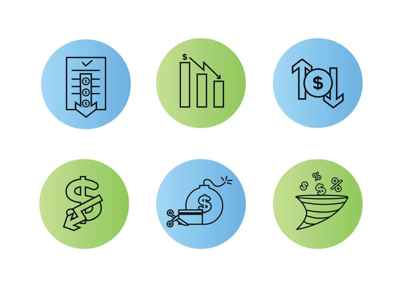 Finance icons set. Vector illustration of devaluation, default. The dollar icon on which the down arrow. Dollar icon in a round frame, on the sides of which there are up and down arrows. Pro Vector
