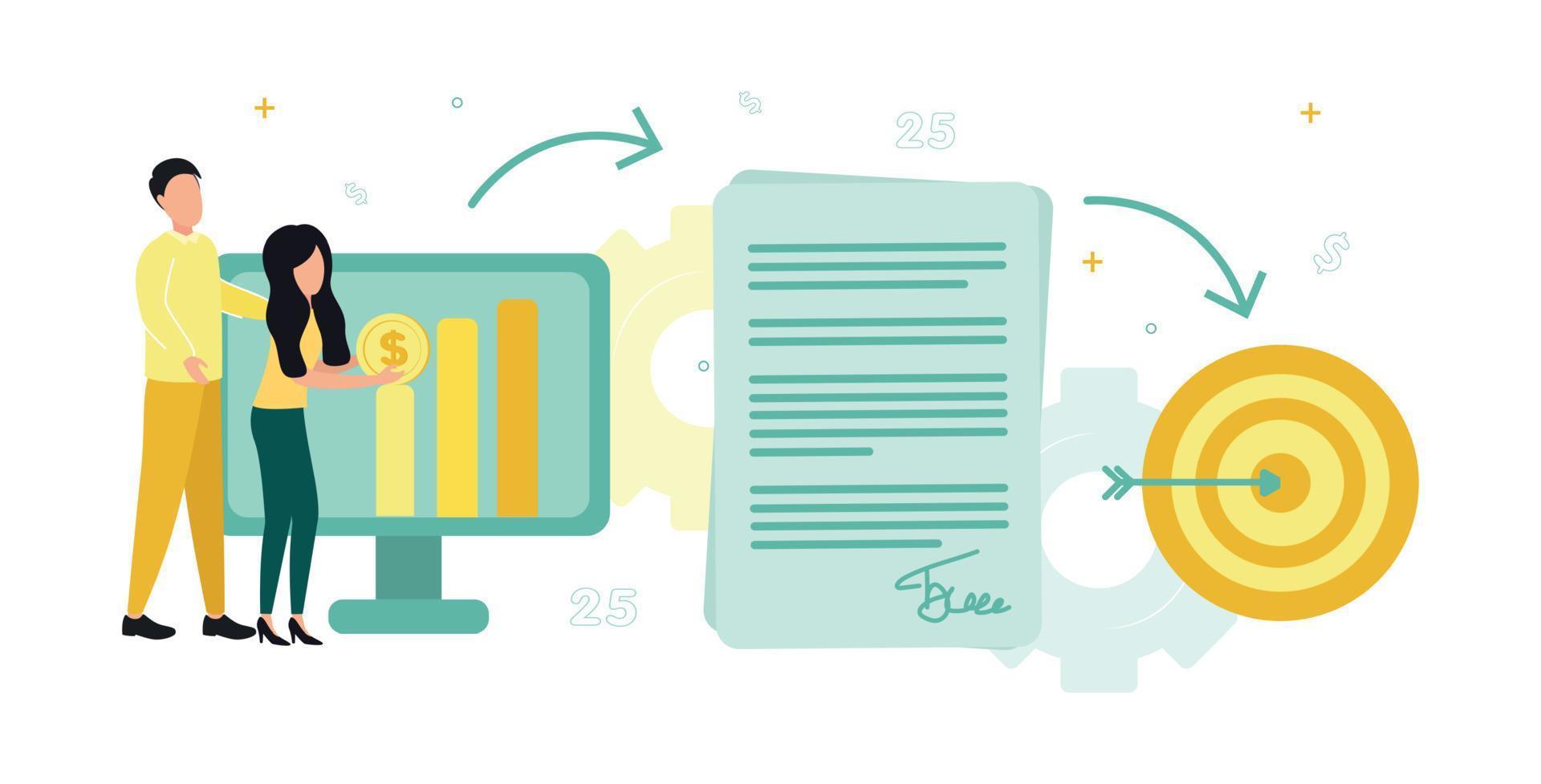 Finance. Financial exchange. People are standing with a coin at the monitor with a diagram, from it an arrow to a document, from a document an arrow to a target with an arrow. Vector illustration Pro Vector