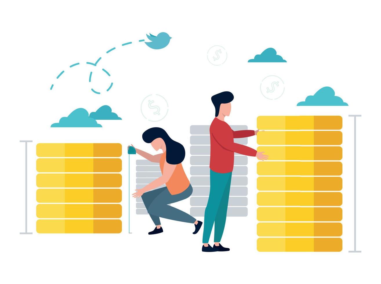 Econometrics bill stacks of different sizes, people measure them with tape-lines and rulers. Vector illustration. Pro Vector