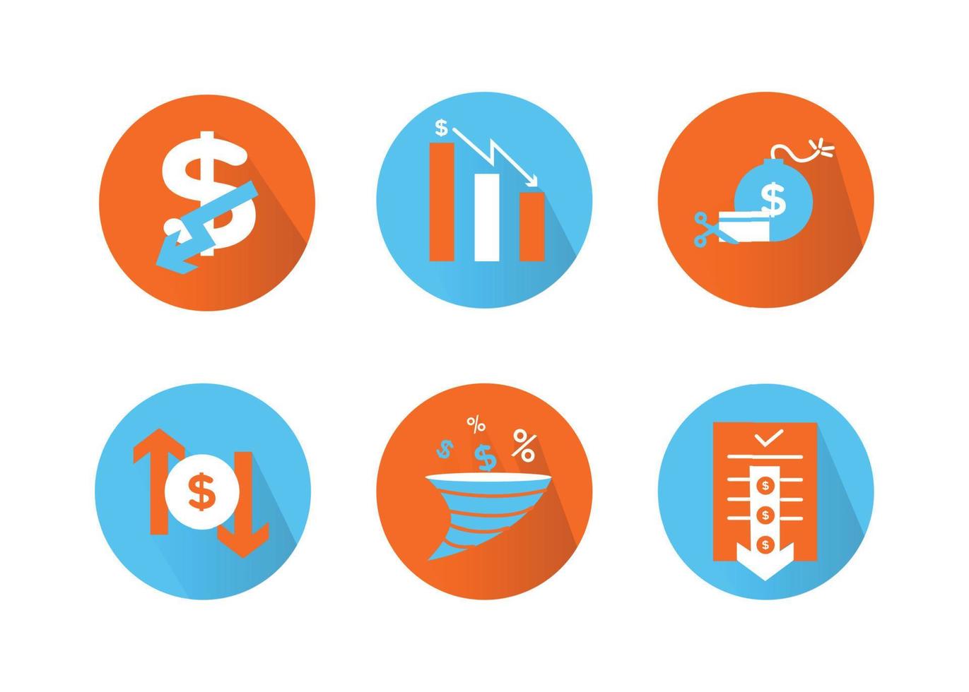 Finance icons set. Vector illustration of devaluation, default. The dollar icon on which the down arrow. Dollar icon in a round frame, on the sides of which there are up and down arrows. Pro Vector