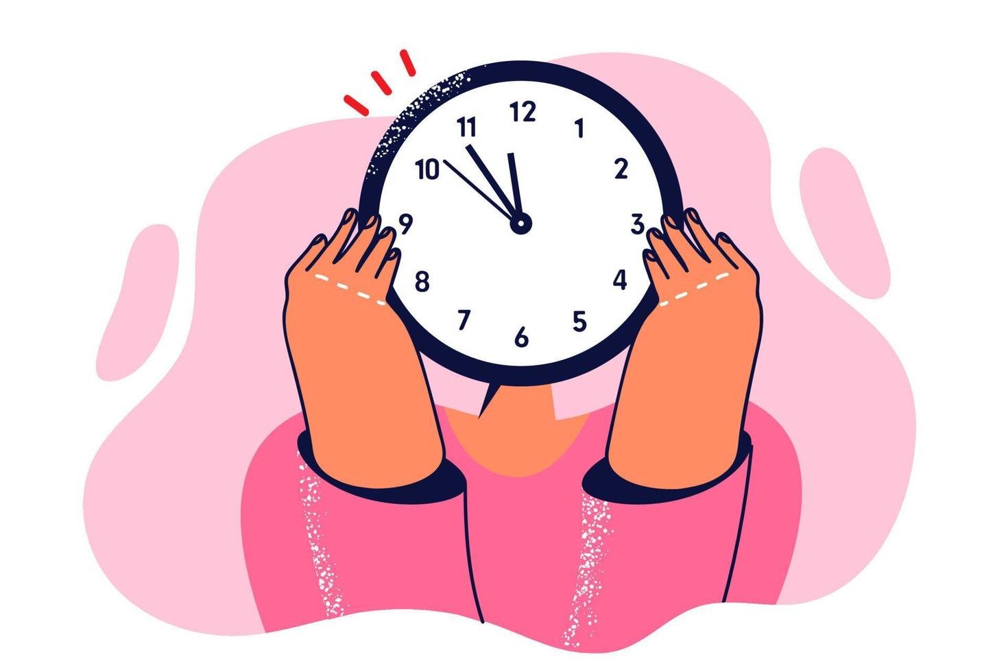 Woman hides face behind watch to show tiredness from regular overwork and overload due to strict deadlines. Concept time management at work to avoid overwork and optimize business processes Pro Vector
