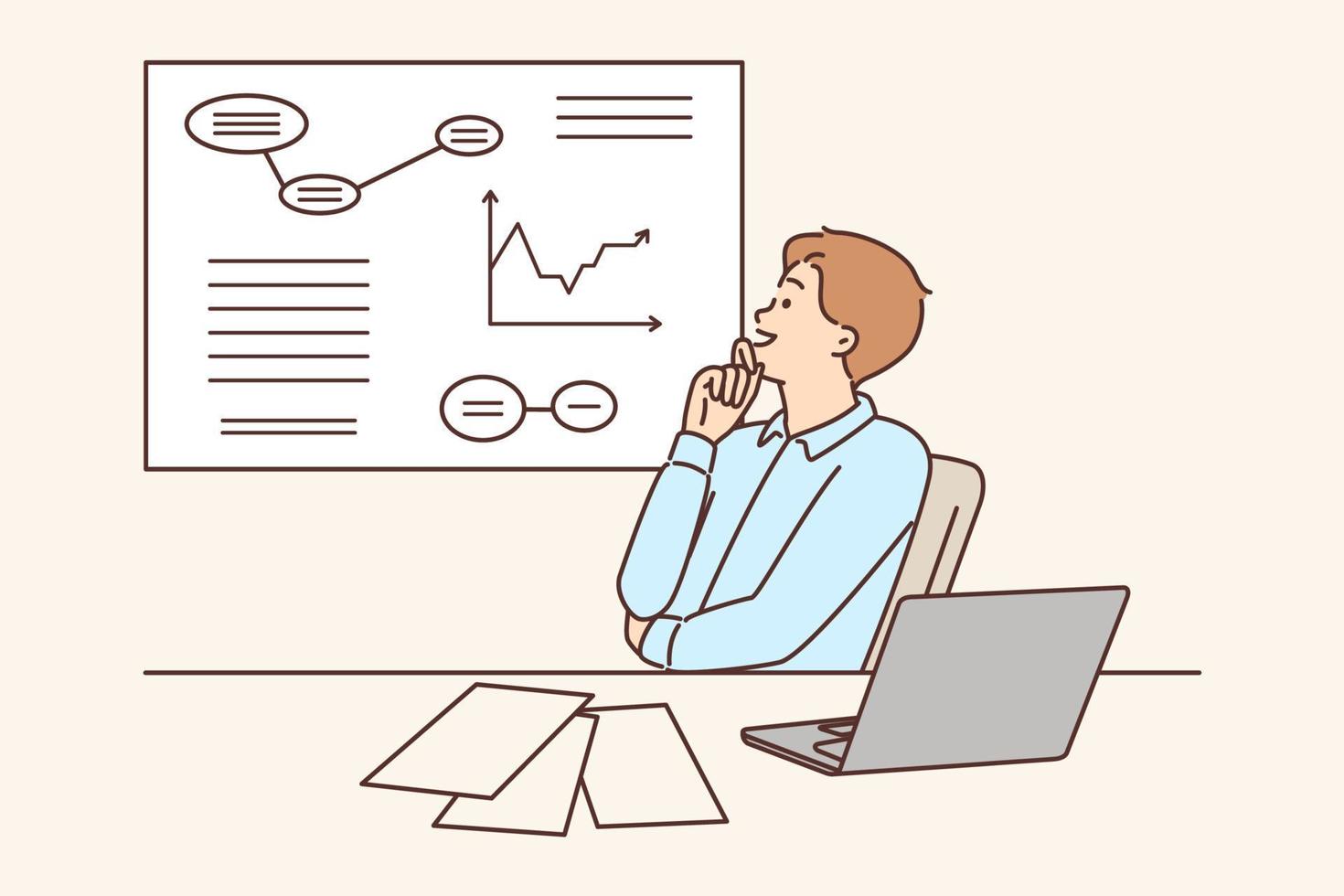Man corporate manager happily looking at growing charts of increasing profits. Guy manager is sitting at table with laptop studying business data on increase in number of customers Pro Vector