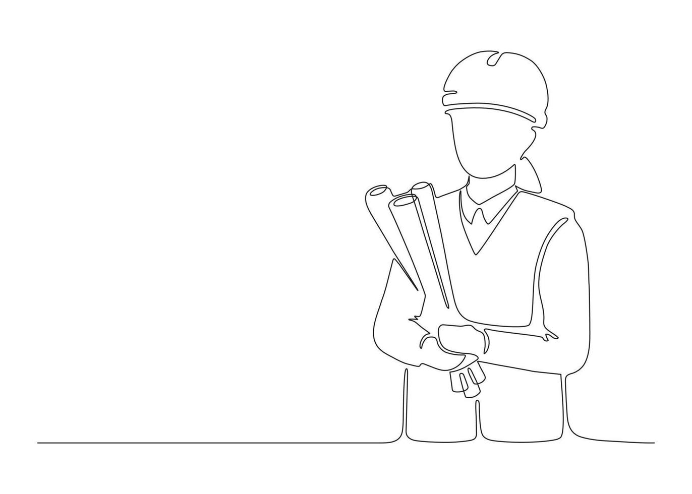Woman architect builder holding blueprint paper in arm, single continuous line drawing. Professional worker in helmet. Plan of building construction on paper. Minimalism one art line draw. Vector Pro Vector
