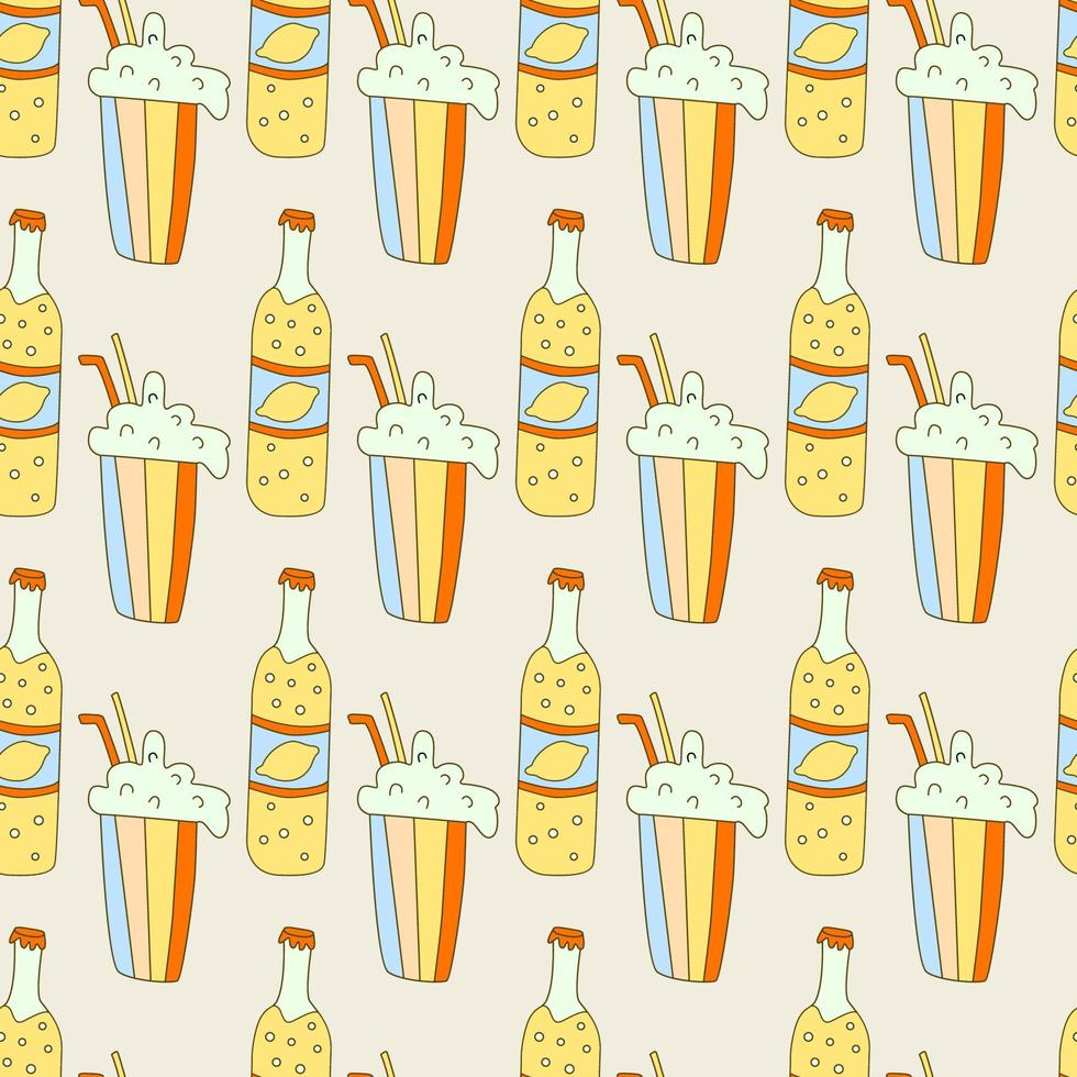 Hippie seamless pattern with cool with bottles of lemonade and drinks. Retro 70s vector illustration. Groovy cartoon style. Pro Vector