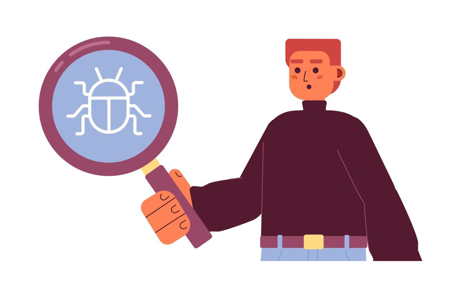 Bug tester with magnifying glass flat concept vector spot illustration. Editable 2D cartoon character on white for web design. Finding mistakes in software creative idea for website, mobile, magazine Pro Vector